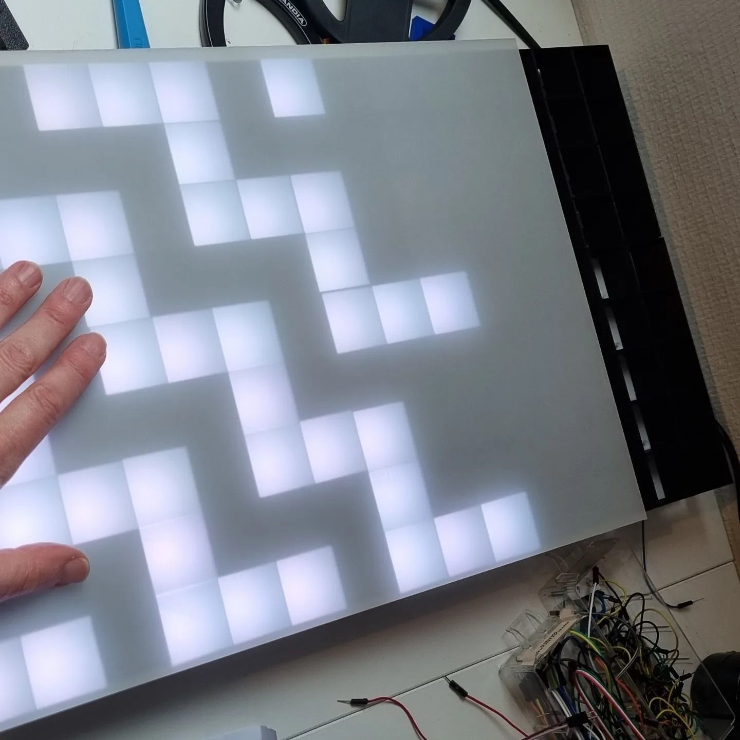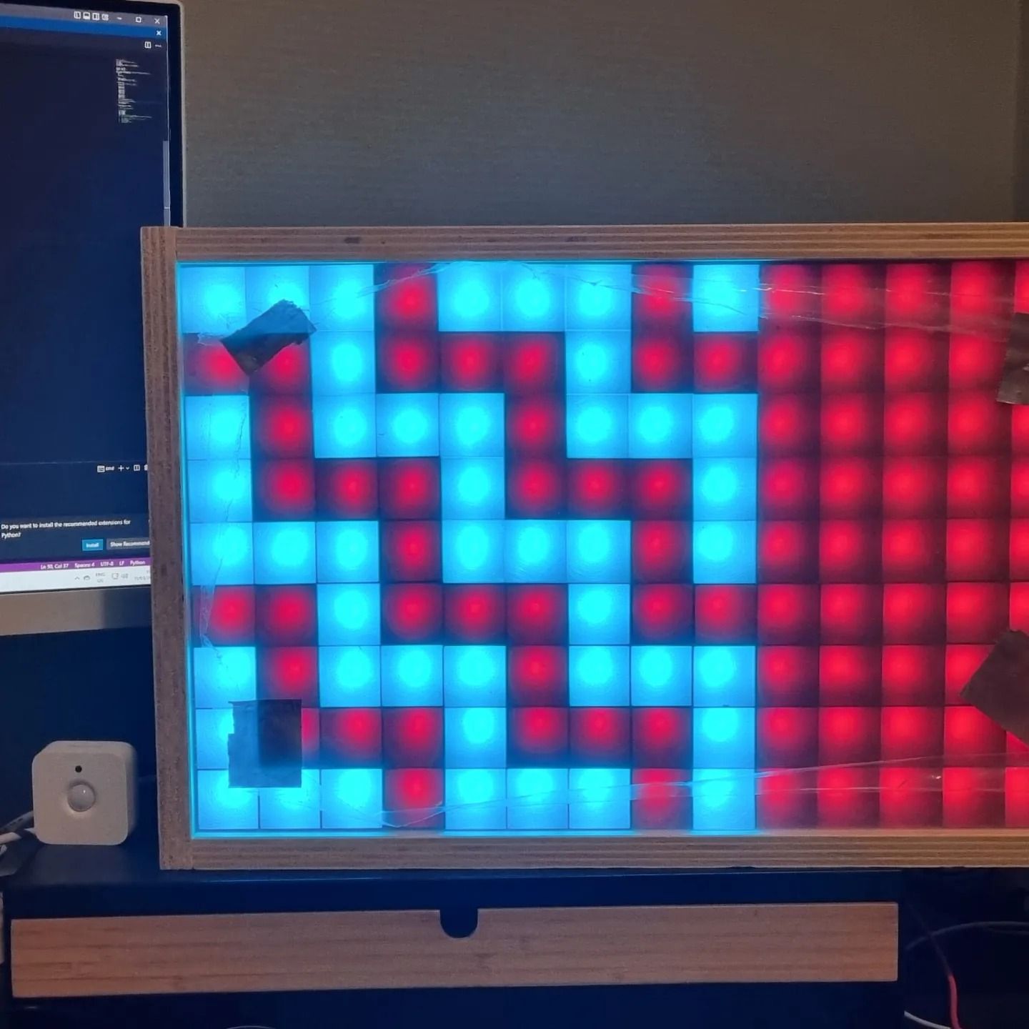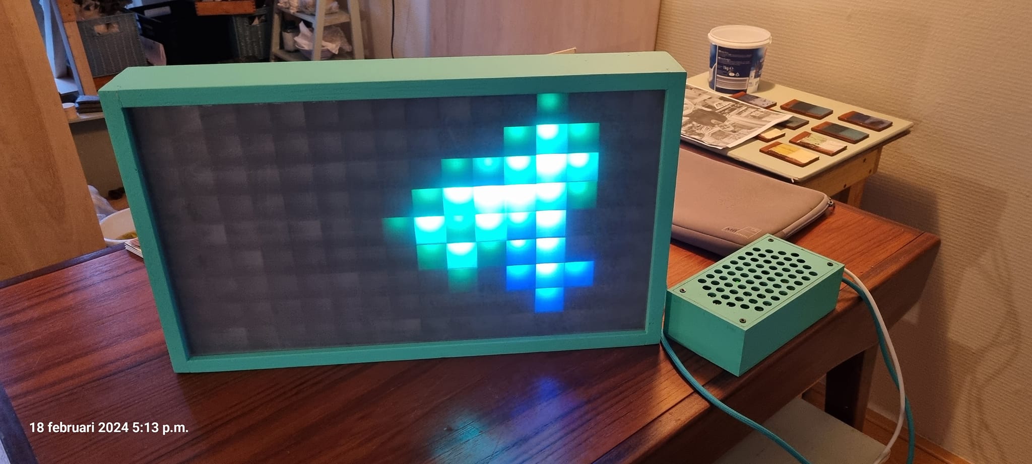 The finished display sits in a wooden frame and can render graphics and animations pixel by pixel. It took patience — populating a 9×16 grid by hand is exactly as tedious as it sounds — but the result is a one-of-a-kind piece made to fit a specific brief that no off-the-shelf product could have answered.
