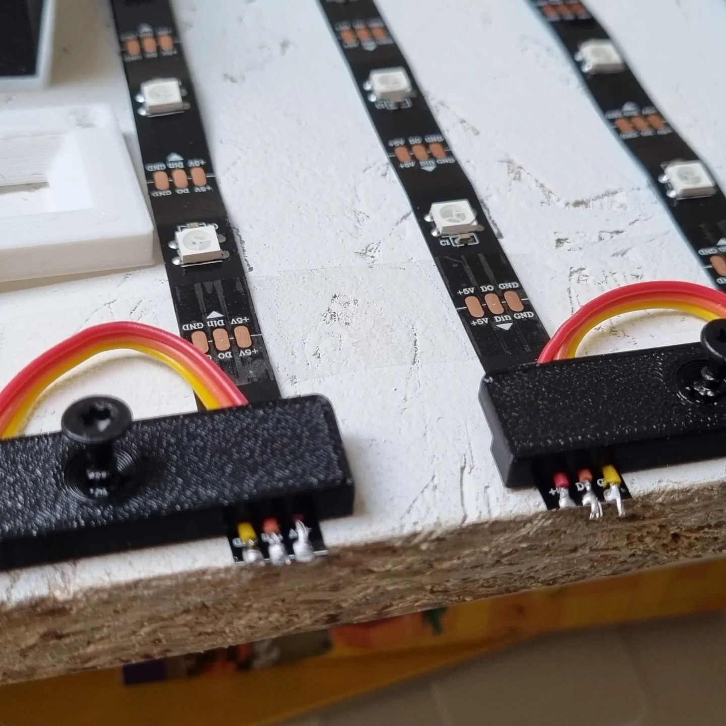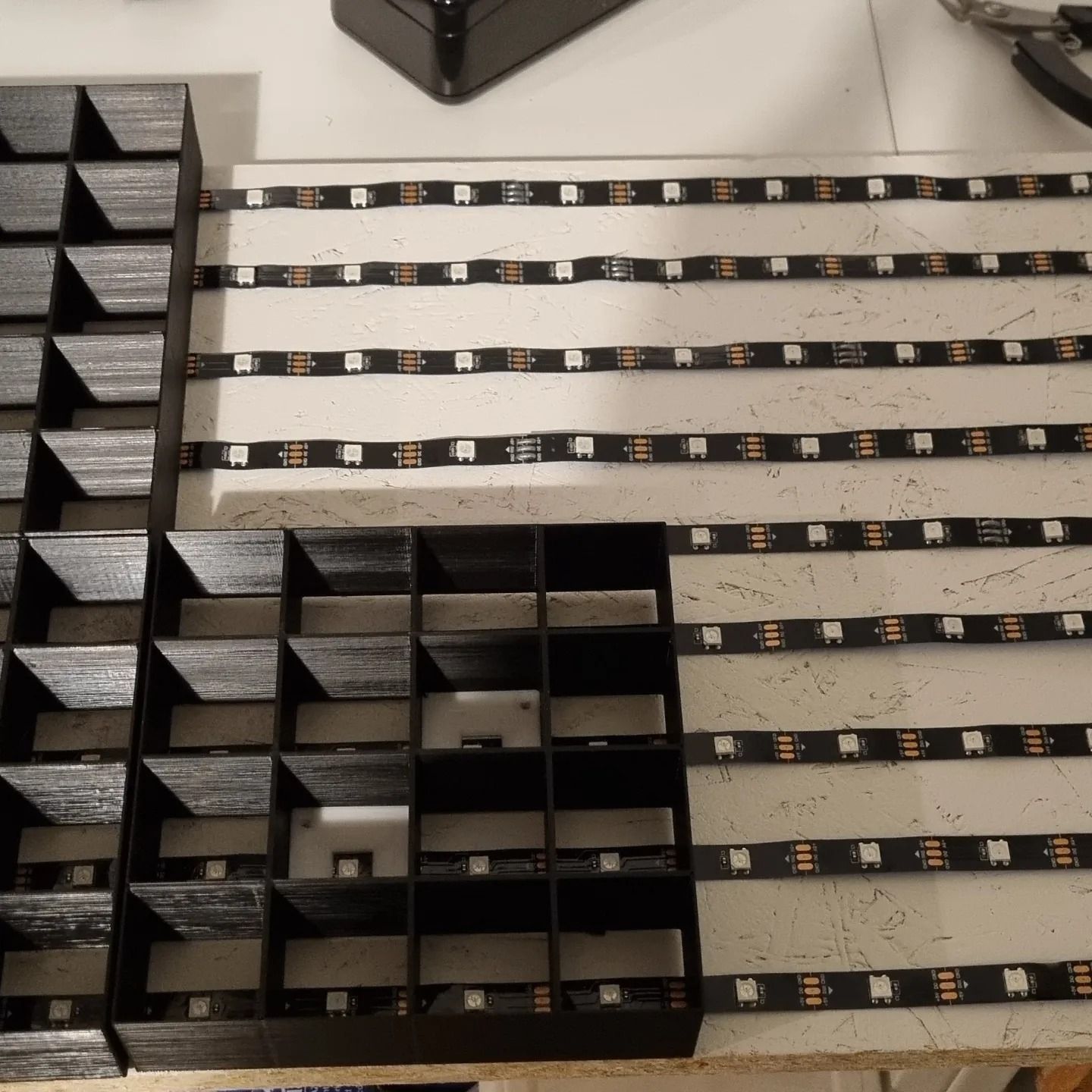 This display was built for NewZag, a company that needed a way to visualize how many businesses they had helped — shown live on a custom pixel matrix. The catch: their logo called for a 9×16 dot matrix, an oddball size you simply can't buy off the shelf. So it was built from scratch: WS2812B LED strips cut to length, a grid of 3D-printed pixel cells assembled row by row, hand-wired connectors between segments, and a lot of soldering. A lot of soldering.