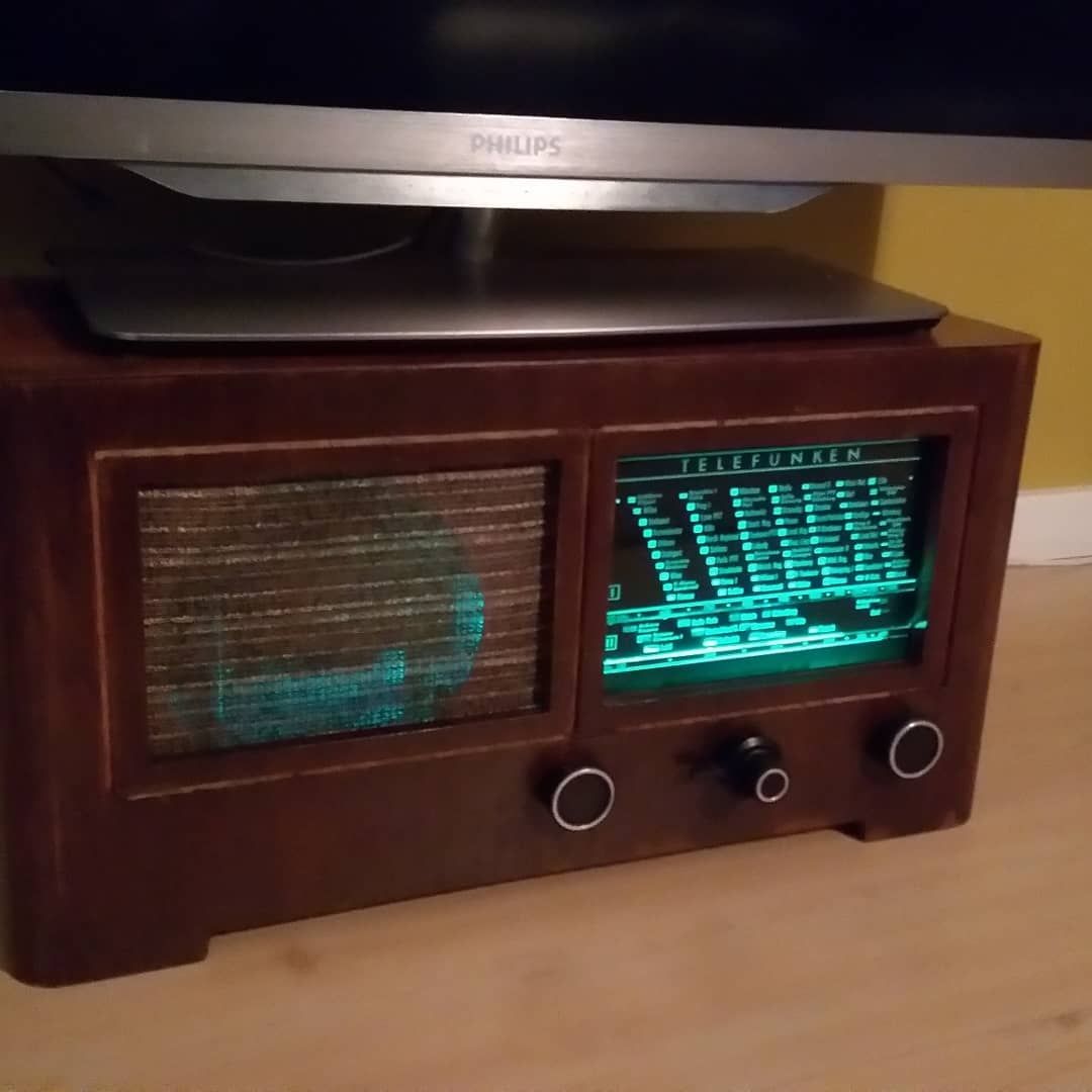 A classic Telefunken wooden radio cabinet, gutted and given a second life — the right way. All the original electronics came out, and in went a Sonos speaker and a USB light bulb tucked inside the cabinet. That's it. No Raspberry Pi, no custom firmware — just good sound and a warm glow coming through the old speaker grille and dial face.